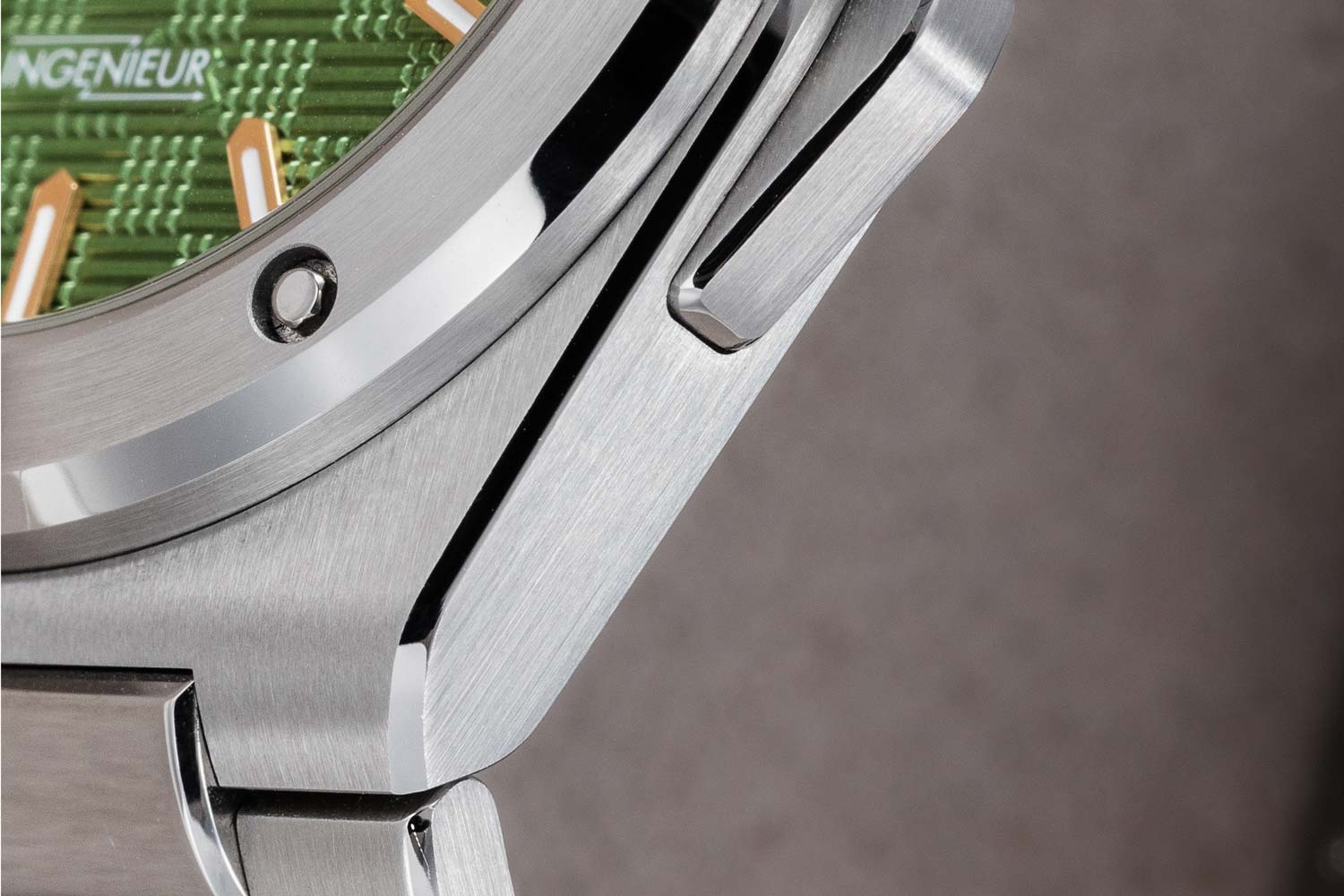 Because of its simpler case design compared to the Royal Oak, the Ingenieur has fewer angular or faceted surfaces to show off advanced finishing techniques. But IWC still managed to add depth and detail. For example, the crown guards, which were not present on the original ref. 1832, have been newly added, and the polished bevels on them are done with care. These bevels continue wherever possible, including along the flanks of the bezel and down the lugs, adding refinement to the overall design.