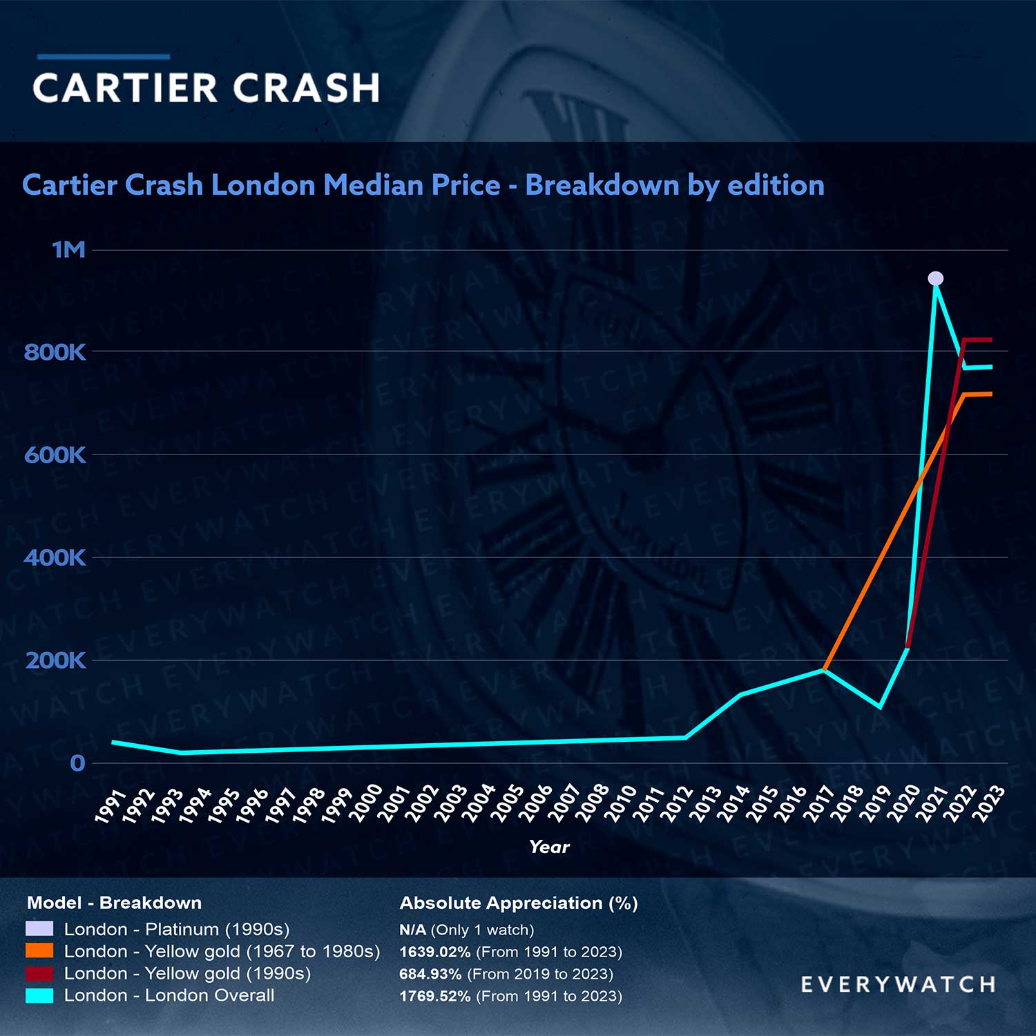 The London Crash surpassed the US$200,000 mark in the following year before the onset of the pandemic era. As mentioned earlier, a 1991 platinum example achieved a remarkable price of US$974,333 in 2021. Last year, four examples of the London Crash emerged. Among them, the first was a splendid 1967 specimen that set a record for the Crash, selling for US$1,513,888 on LoupeThis. The second was a 1990 example, which garnered US$825,029 at Christie’s and the third, a piece from 1989 sold for US$717,363. In contrast, the fourth, a 1970 example, fetched a considerably lower price of US$453,600 despite it being an early example. This was likely due to authenticity concerns raised by Perezscope prior to the auction.