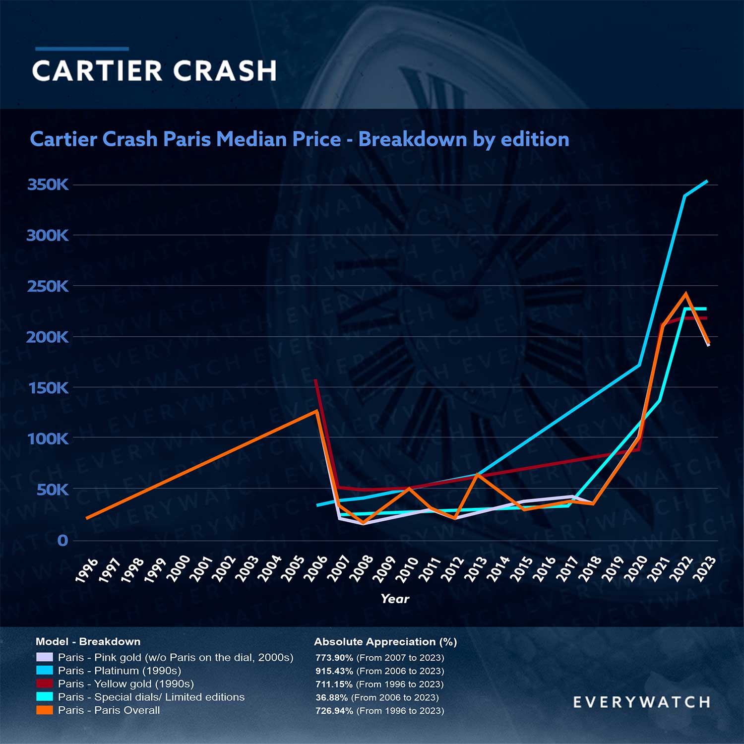“The Paris Crash in platinum demonstrates impressive growth, comparable to the London version, and is relatively rare, suggesting potential for further market expansion from its latest sale in 2023,” says Prigigallo.