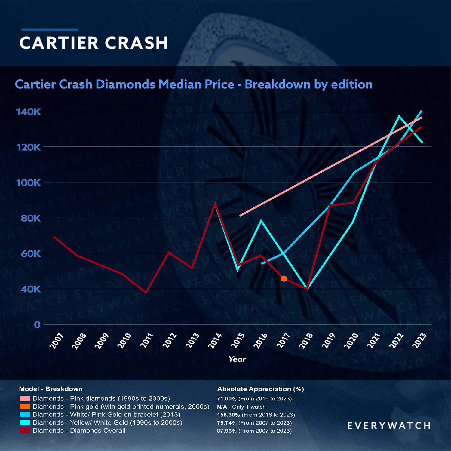 The years spanning from 2007 to 2014 since the Crash Diamonds started surfacing at auction shows an intriguing narrative. Until 2014, the Crash Diamond commanded more than a London Crash and until 2019, more than a Paris Crash. For instance, in 2012 a London Crash sold for US$43,750 while a white gold diamond Crash fetched a sum of US$72,258 in the same year. This demonstrates that the Crash models were initially assessed based on their material value rather than historical significance.