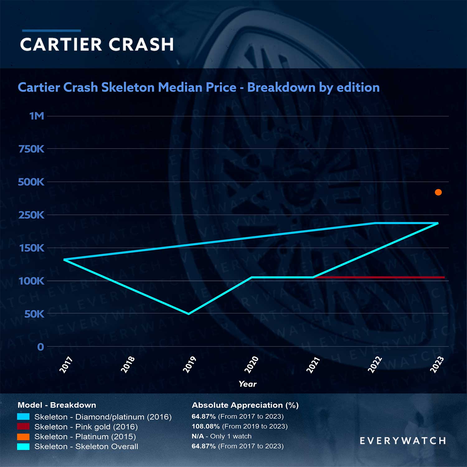 The Paris Crash only started its upward trajectory in 2019, and in 2021 and 2022, it surpassed the US$200,000 mark, outpacing all other Crash models except for the London Crash. The sudden price increase can undoubtedly be attributed to the pandemic while its overtaking of other Crash models is probably a result of the London Crash watches being scarce and increasingly unattainable. Fast forward to 2023, the Crash Skeleton has yet again overtaken the Paris Crash. The platinum Crash Skeleton achieved a price of US$279,400 at Phillips in June, whereas the median price for the Paris Crash fell slightly to US$192,746. However, for a direct metal-to-metal comparison, a platinum Paris Crash sold for US$353,368 at Phillips in May. This suggest that the Crash Skeleton is appropriately recognized and valued for its unique mechanical and aesthetic attributes while the Paris Crash has gained broader acceptance and is seen as a compelling alternative to the London Crash despite its smaller dimensions.