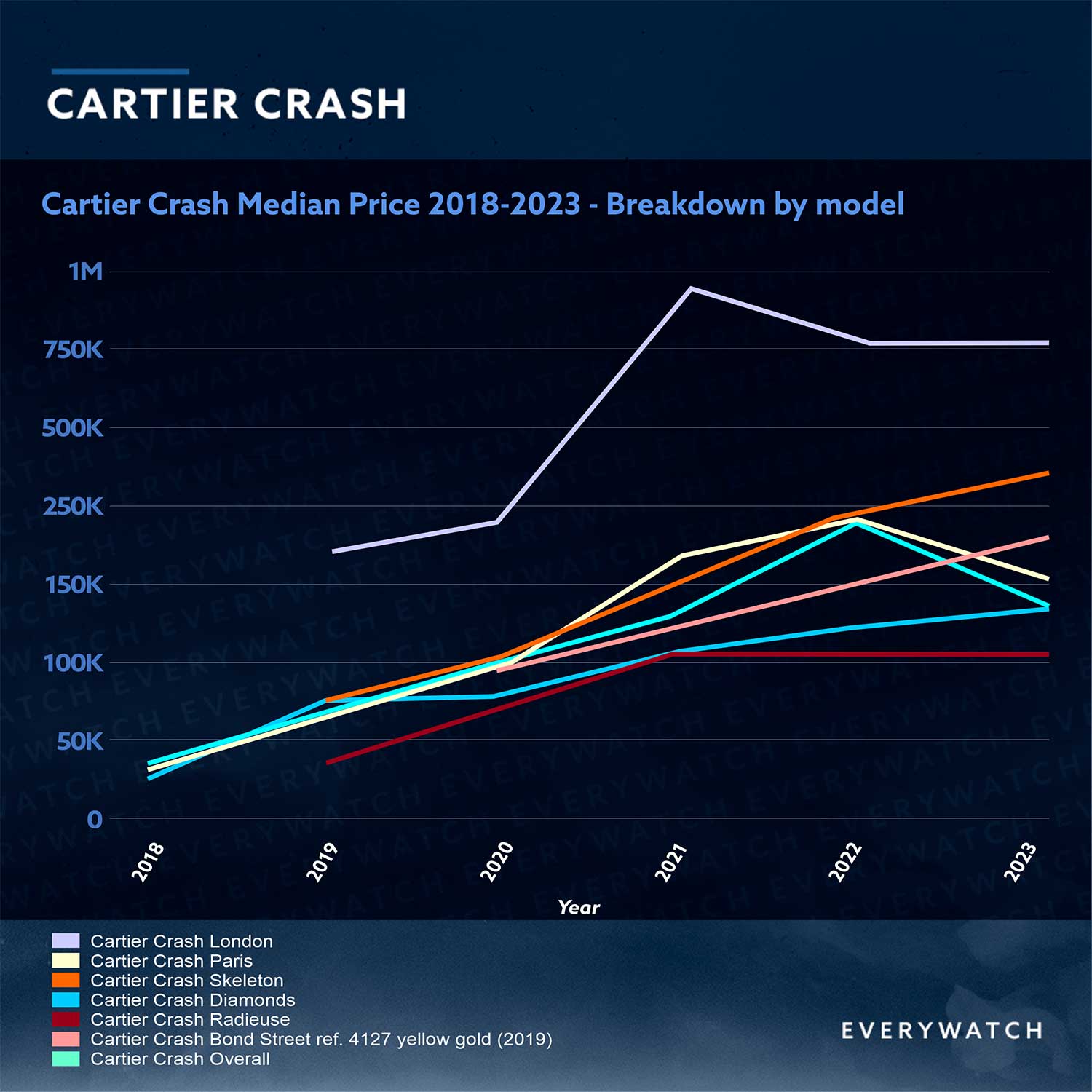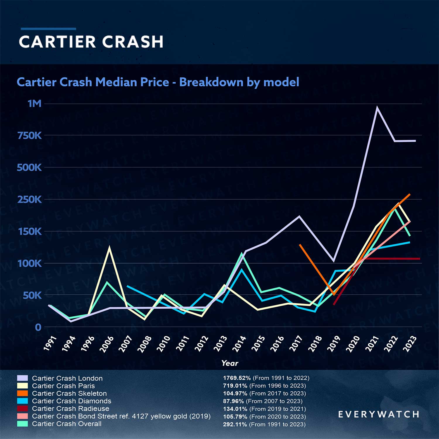 Giovanni Prigigallo, co-founder of EveryWatch highlights, “The London Crash, while highly valuable and a top performer today, has a higher unsold rate compared to subsequent models. This phenomenon could potentially be attributed to an initial lack of awareness and appreciation, stemming from the scarcity of information available about them at the time.”