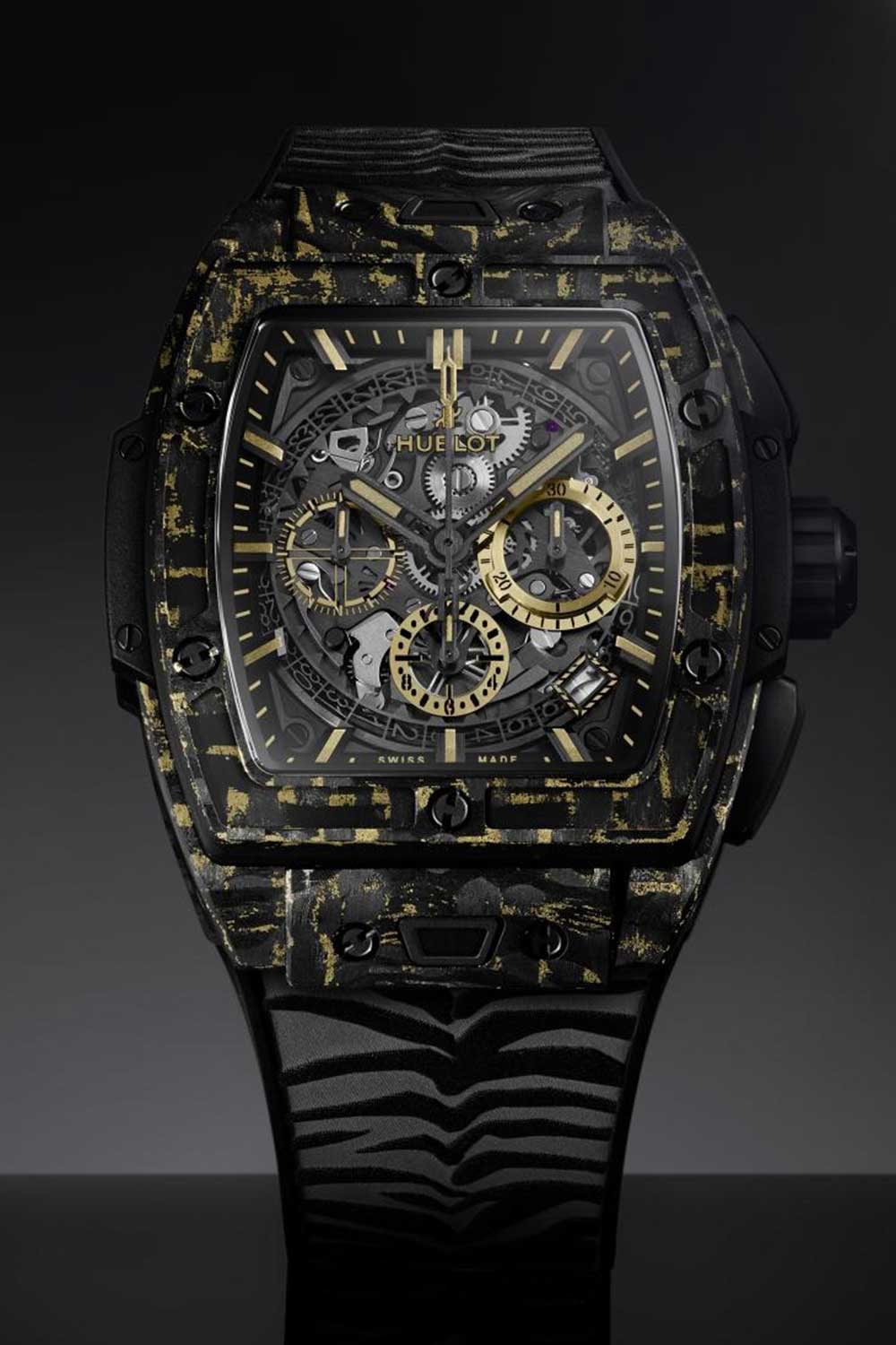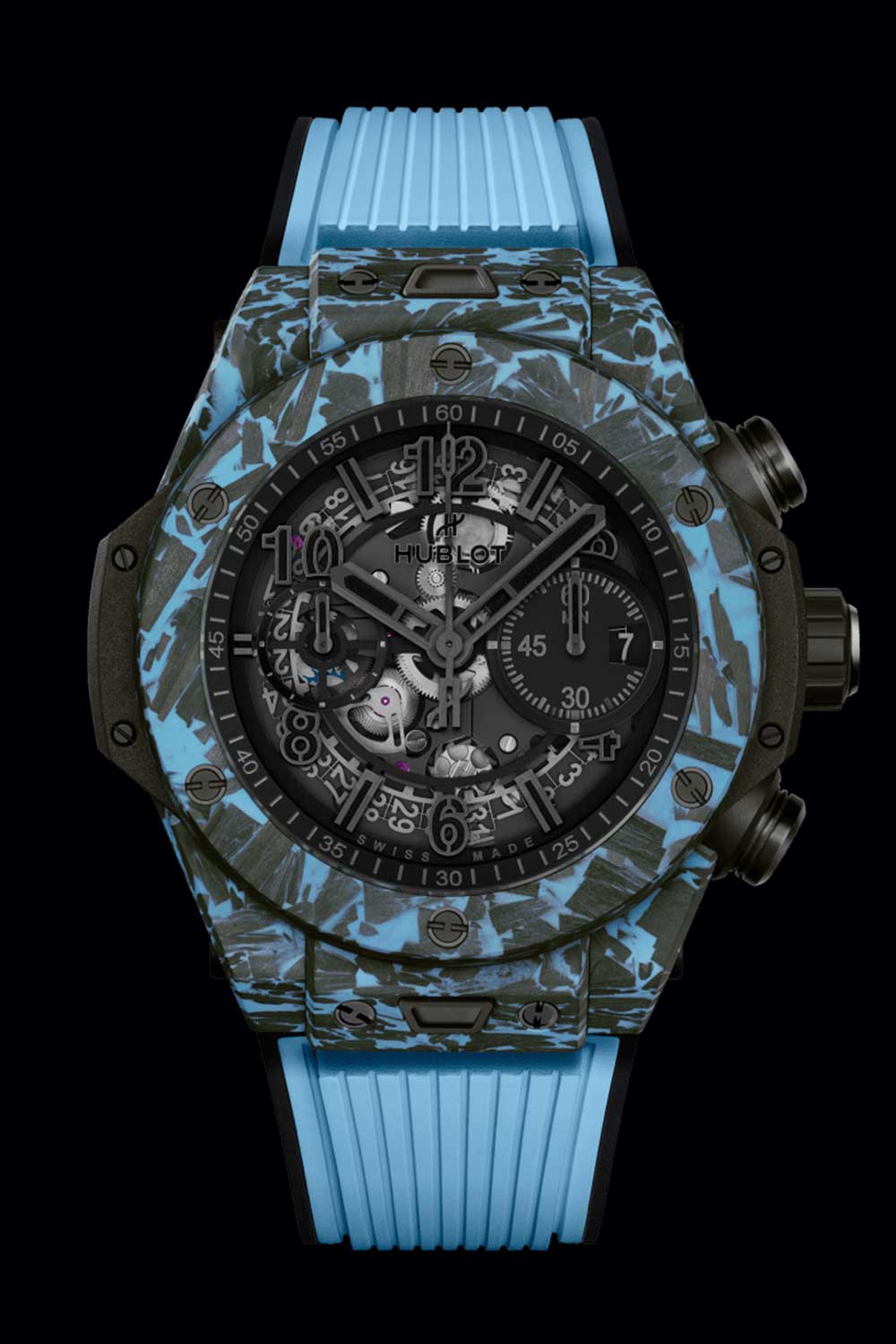 Going far beyond the classic plain-woven carbon fiber case which appeared in Hublot’s watches as early as in 2005, the manufacture has amassed an impressive repertoire of carbon composite references throughout the years, several of which are completely unprecedented in luxury watchmaking. Utilizing colored carbon in a plethora of hues, styles and forms, Hublot’s deft hand in manipulating this material opened up a world of new possibilities.