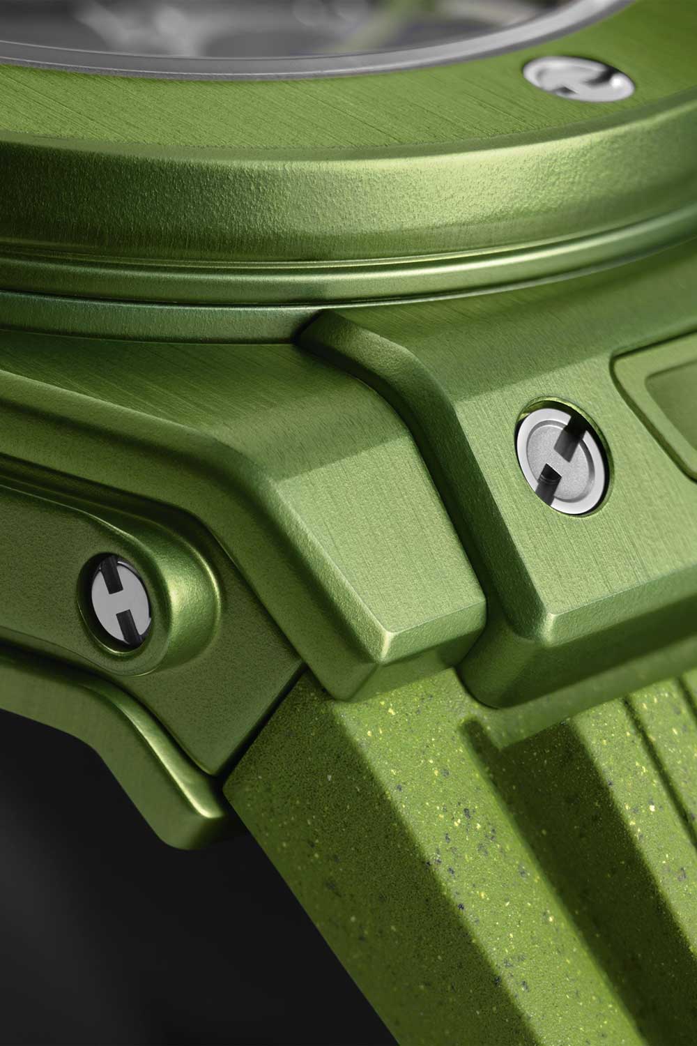 Urban culture has also inspired Hublot in other ways. In 2023, the brand collaborated with fellow Swiss company Nespresso to take the conversation of innovation and sustainability further. The result was an unprecedented timepiece, Big Bang Unico Nespresso Origin, which made the most out of used Nespresso capsules and coffee grounds. Its vibrant green case, bezel, crown and pushers were made from recycled aluminum, 28 percent of which derived from Nespresso Peru Organic capsules. Meanwhile, the fabric strap was made in collaboration with a third partner, Singtex, which specializes in using recycled coffee grounds for textiles. A second strap in rubber also contains 4.1 percent coffee grounds and 8.2 percent recycled rubber, in addition to Hublot’s standard formula for rubber.