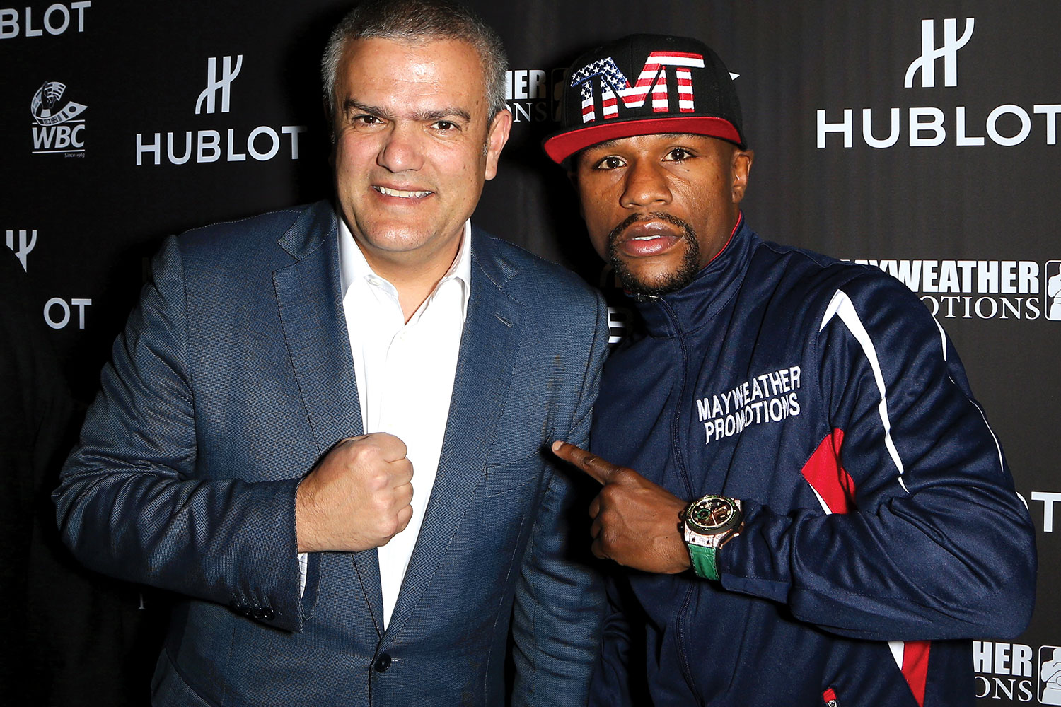 Former CEO of Hublot, Ricardo Guadalupe (left), presented WBC/WBA welterweight champion Floyd Mayweather Jr. (right) with King Power WBC Hublot watch at “Hublot and Floyd Mayweather Jr.: The Perfect Combination For The Fight Of The Century” at the MGM Grand Garden Arena on May 1, 2015 in Las Vegas, Nevada. (Photo by Gabe Ginsberg/Getty Images for HUBLOT)