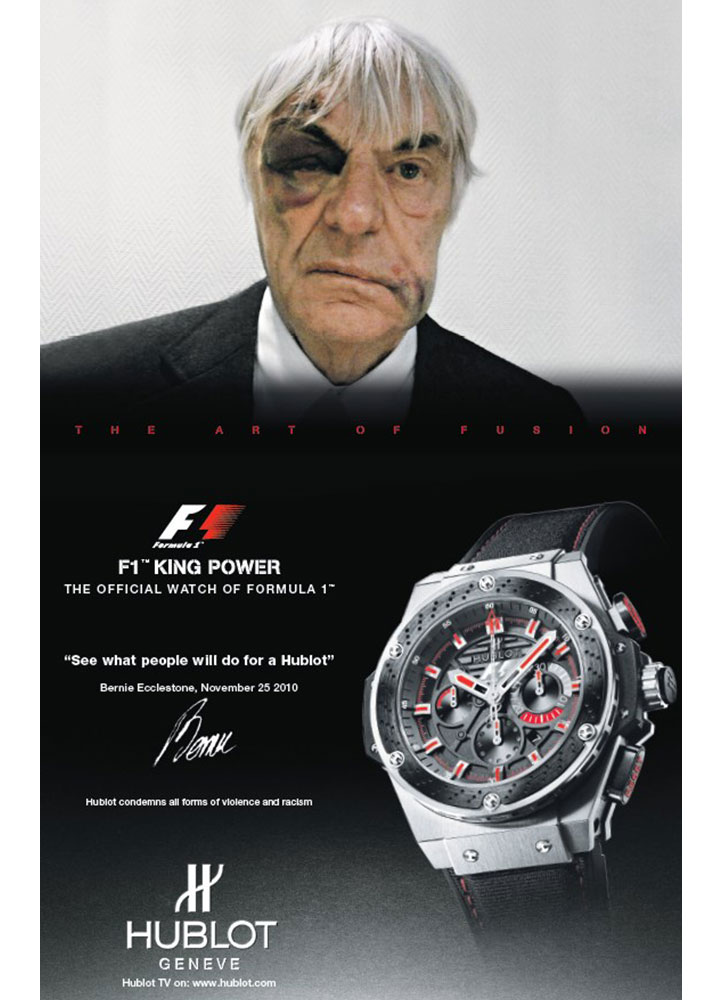 In 2010, Hublot partner Bernie Ecclestone was the victim of a widely reported mugging in London, his Hublot F1 King Power among the valuables stolen from him. After newspaper pictures of Ecclestone sporting a black eye and other bruises appeared in the global press, Hublot marketeers quickly jumped into action. Within days, an advert appeared with Ecclestone’s bruised face and a quote from him reading: “See what people will do for a Hublot”.