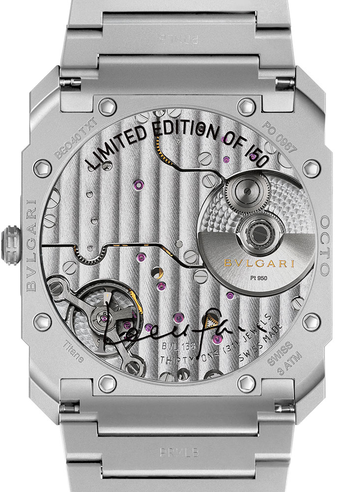The Octo Finissimo Lee Ufan × Bvlgari is powered by the ultra-thin BVL 138 in-house caliber with platinum micro-rotor, which measures just 2.23mm thin while wielding an impressive 60-hour power reserve. As with its predecessors, the caseback is transparent, with the artist’s handwritten signature on each of the 150 pieces in the limited edition.
