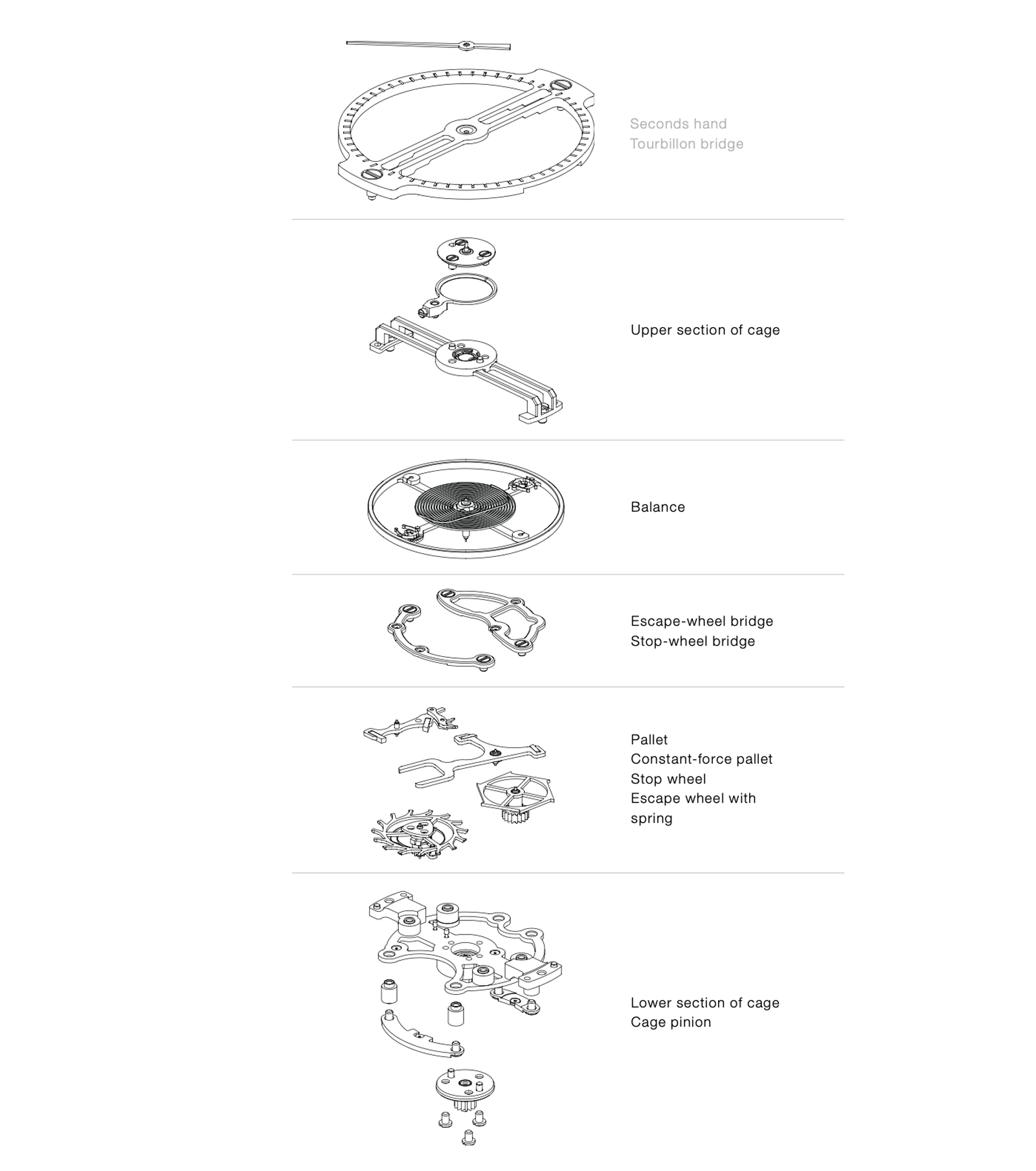 An explosion view of Andreas Strehler’s Trans-Axial Tourbillon with the remontoir mechanism located beneath the cage. Attached to the base of the cage is a lever with a stopping jewel which locks and unlocks a star wheel that is attached to a satellite arm which sits on the cage pinion. As the lever rotates along with the tourbillon cage, the tip of the jewel slides past one tooth of the star wheel, releasing the remontoir spring, allowing the star to rotate forward by one step until the next tooth of the star contacts the jewel.