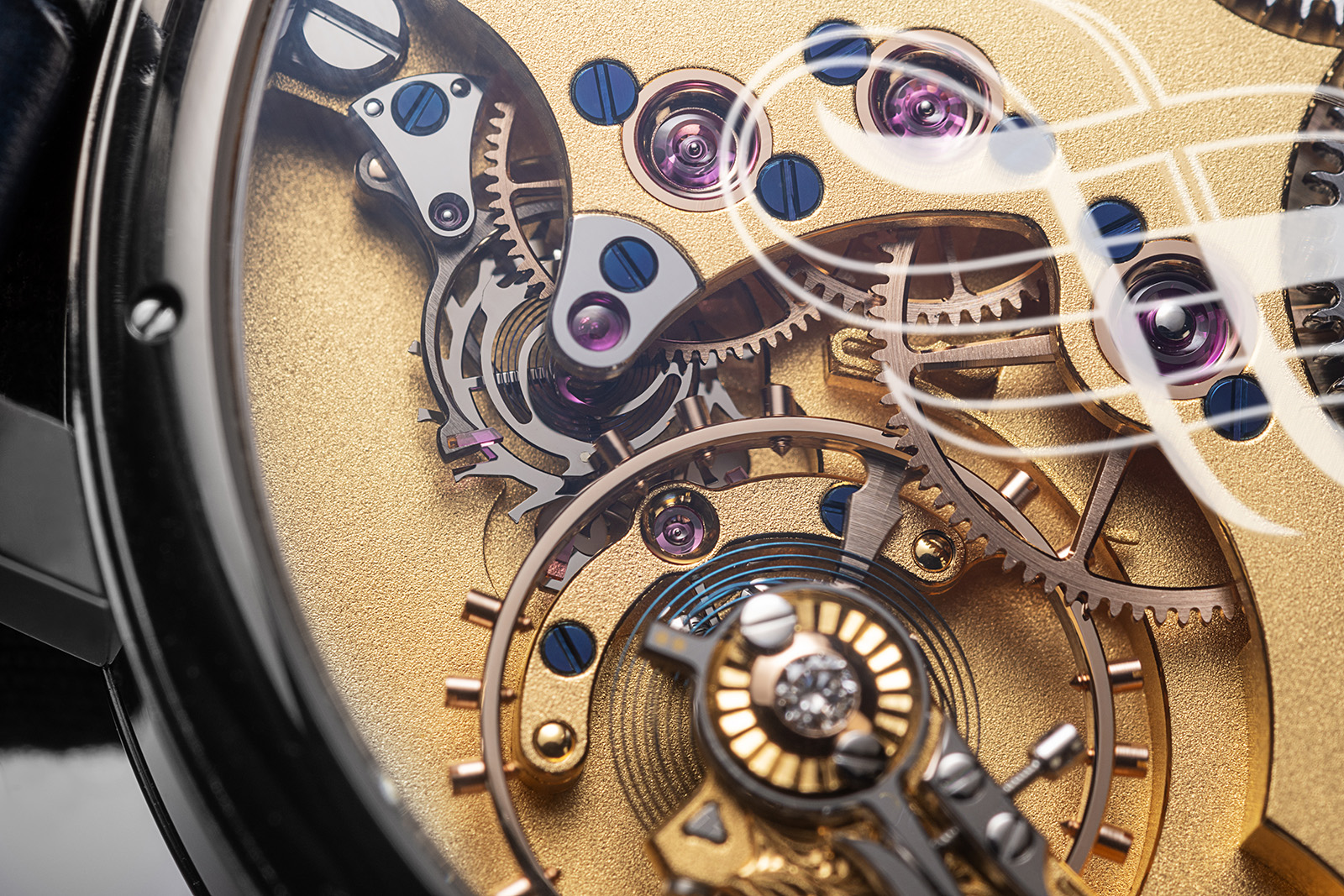 The remontoir has been effectively flipped upside down: the remontoir spring is positioned between the satellite arm and the base of the tourbillon cage. The spring, which is recharged every second, powers the rotation of the cage. As the cage turns, it drives the escape wheel around a fixed fourth wheel, which in turn impulses the balance wheel. The result is an incredibly intelligent integration of the remontoir and tourbillon into a single assembly.