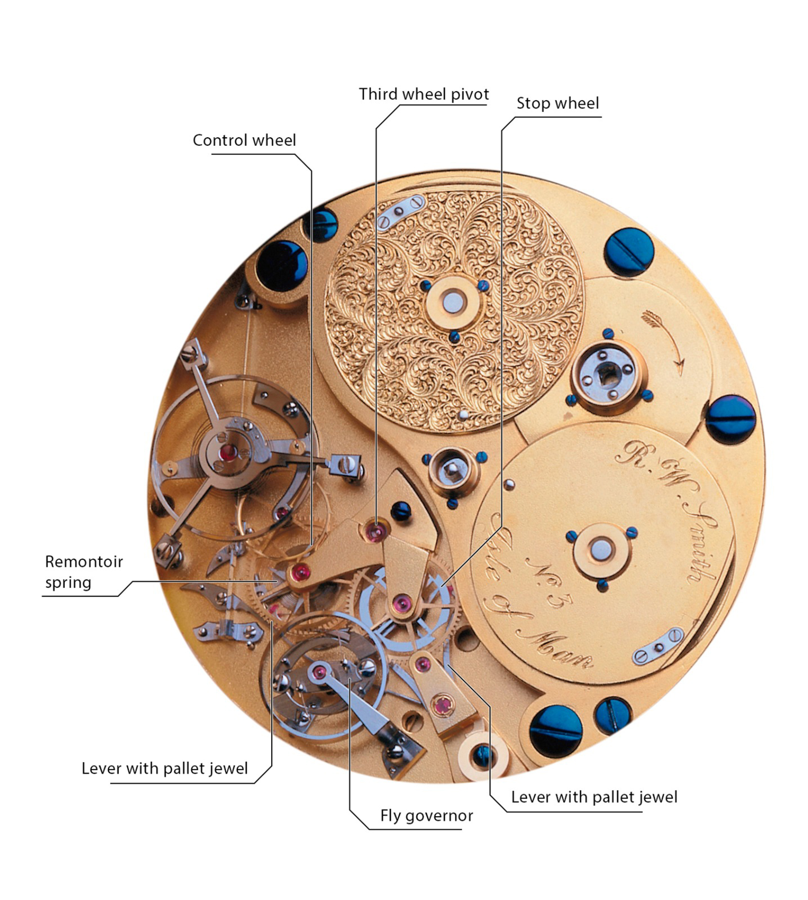 The remontoir spring, along with a control wheel shaped as a four-pointed star, are located beneath the fourth wheel in the going train. Power flows from the third wheel to the pinion of the fourth wheel, which drives the escape wheel as usual. Simultaneously, power is also transmitted from the third wheel pinion to a separate remontoir train that includes a stop wheel and a fly governor.