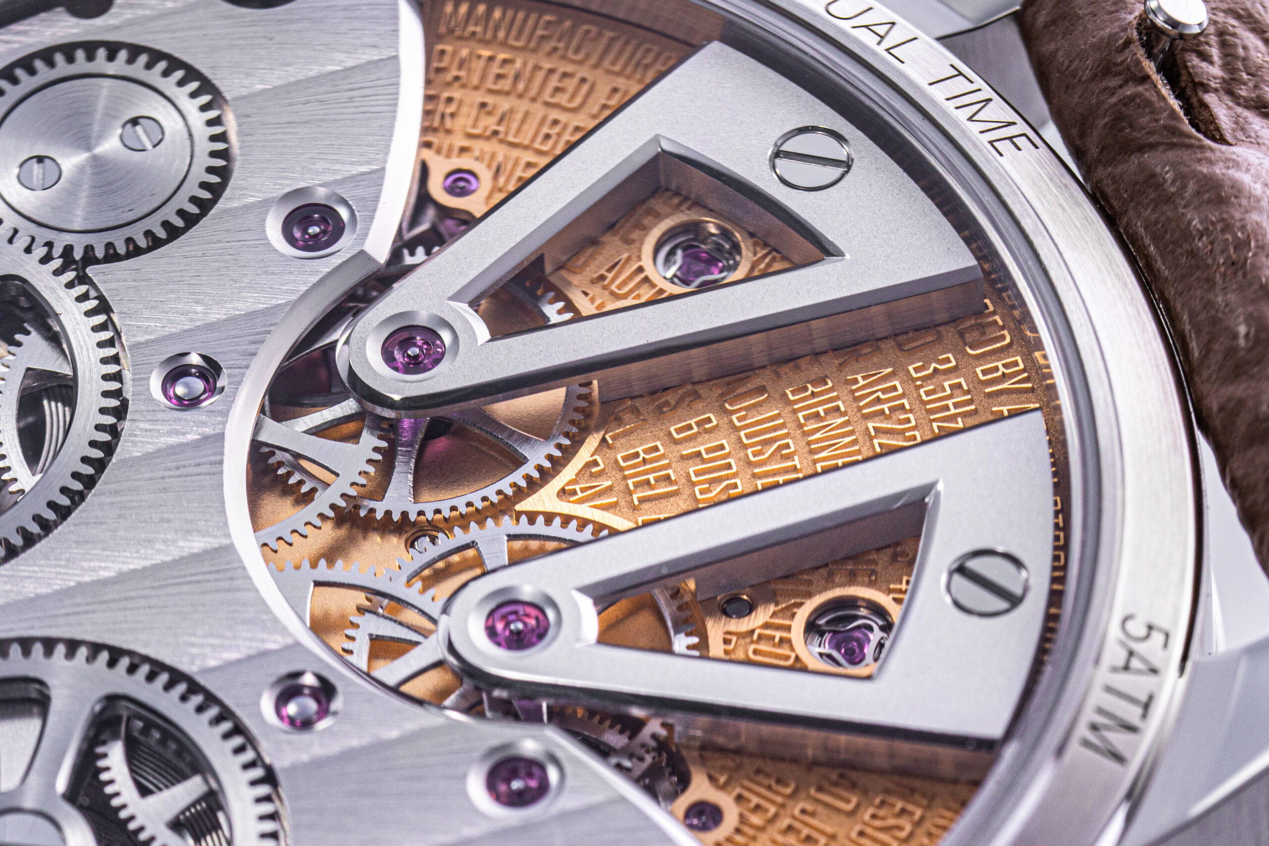 - Close-up of Caliber ARF22, engraved with its specifications and marked for dual time resonance.