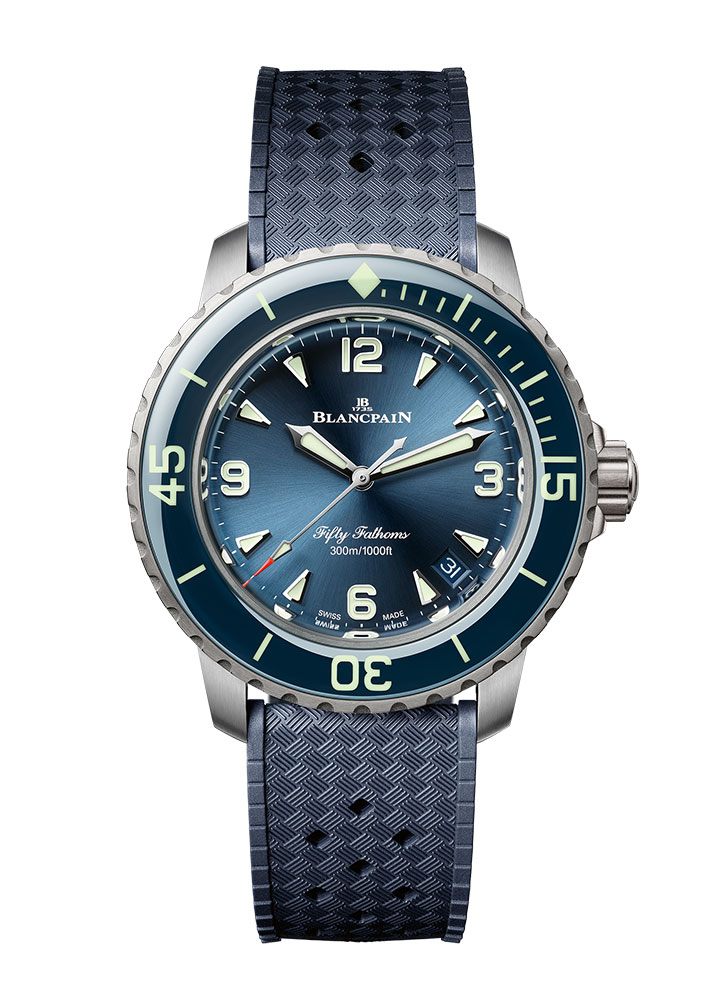 - Fifty Fathoms 38mm in grade 23 titanium with a sunburst blue dial