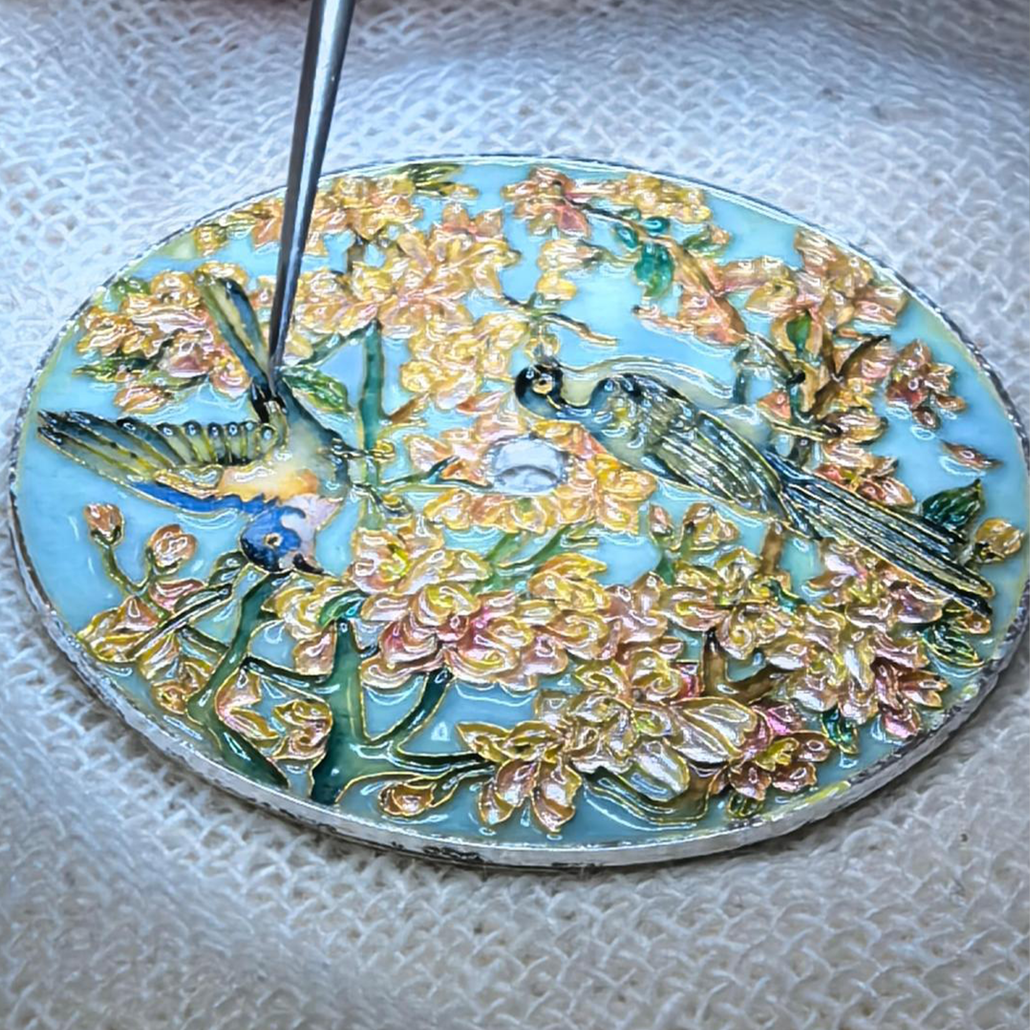 The creation process begins with shaping a mold from red copper. Artisans then sketch the design onto the mold and apply fine copper wires to form the decorative outlines. These cells are filled with colorful enamel paste, followed by repeated kiln-firing, polishing and gilding to achieve the final piece. Jing tai lan masterfully fuses the techniques of bronze work and porcelain artistry, incorporating traditional Chinese painting, sculpture and engraving. It is considered one of the most intricate and demanding enameling techniques.