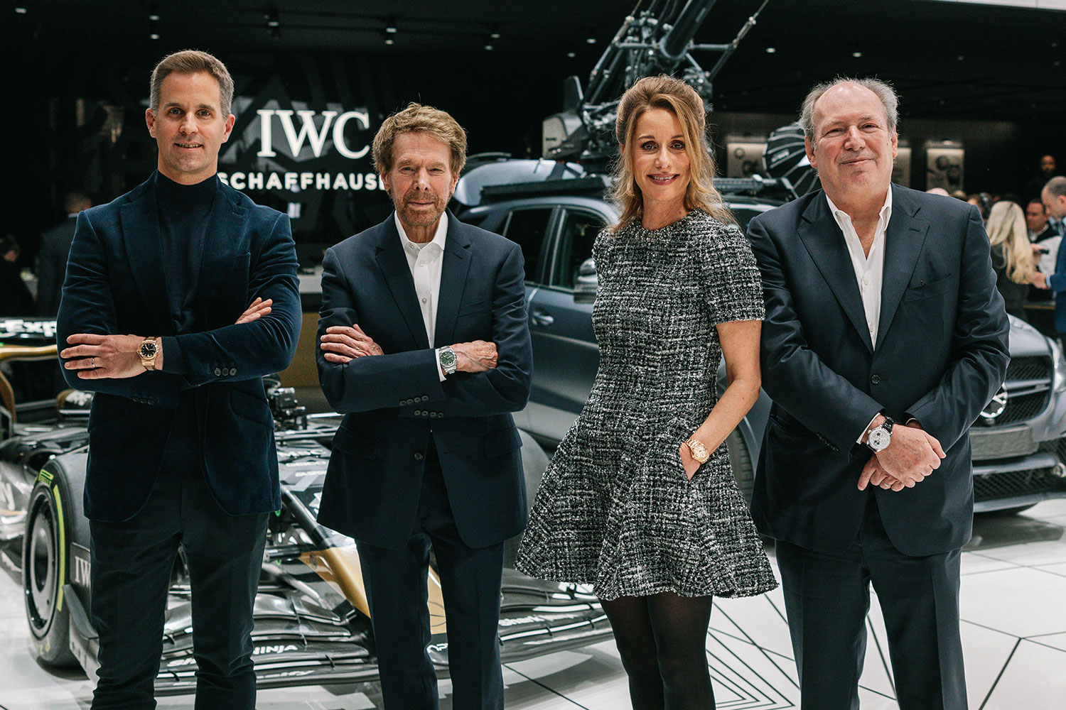 From left: IWC Schaffhausen CEO Chris Grainger-Herr, Jerry Bruckheimer, IWC Schaffhausen CMO Franziska Gsell and Hans Zimmer at the IWC Schaffhausen booth at Watches and Wonders Geneva on April 03, 2025 in Geneva, Switzerland. (Photo by Remy Steiner/Getty Images for IWC)