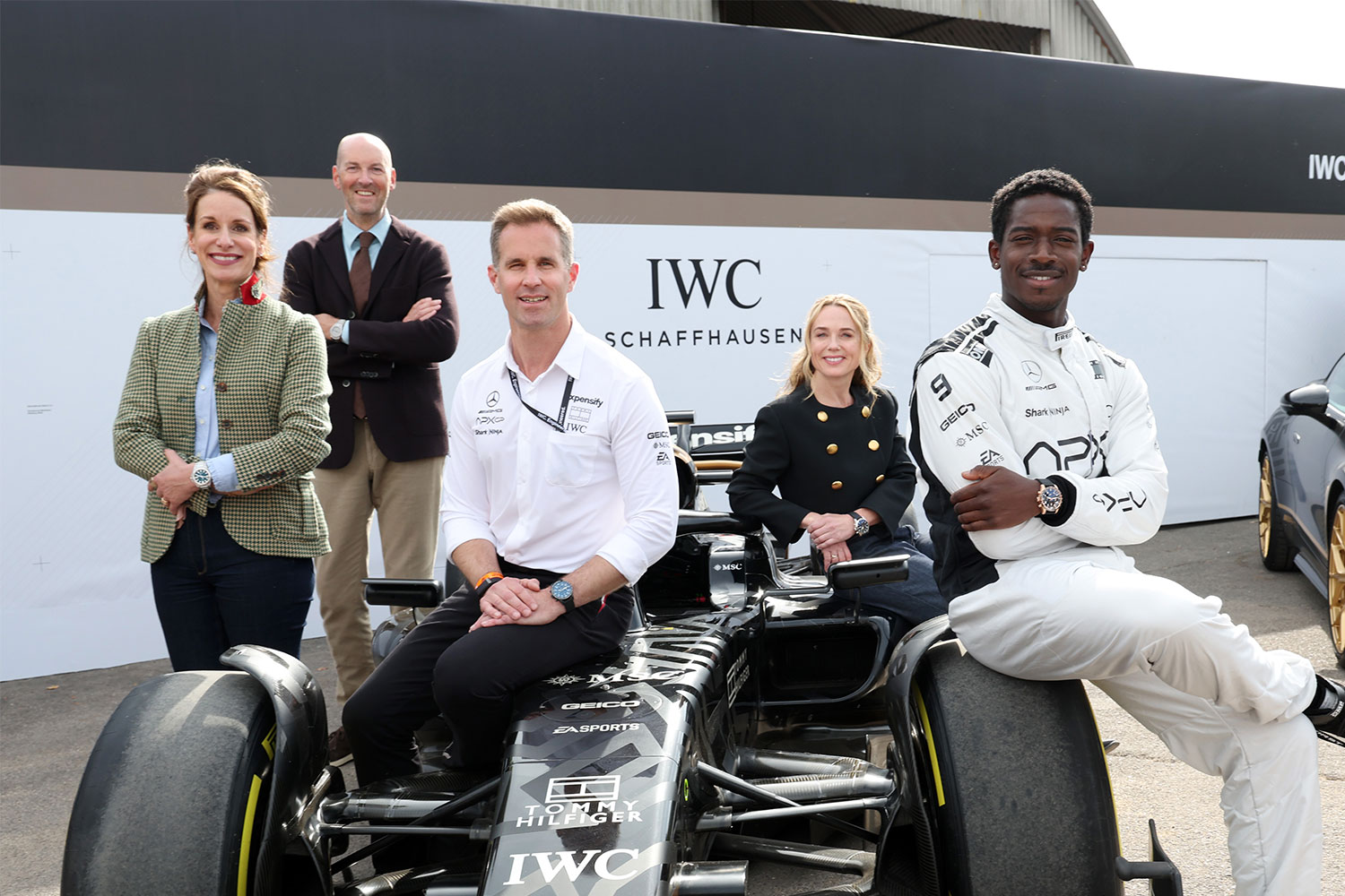 From left: Franziska Gsell, Chief Design Officer Christian Knoop, Chris Grainger-Herr, and actors Kerry Condon and Damson Idris, at the Goodwood Members Meeting in Goodwood on April 12, 2025 near Chichester, England. (Photo by Tristan Fewings/Getty Images for IWC)