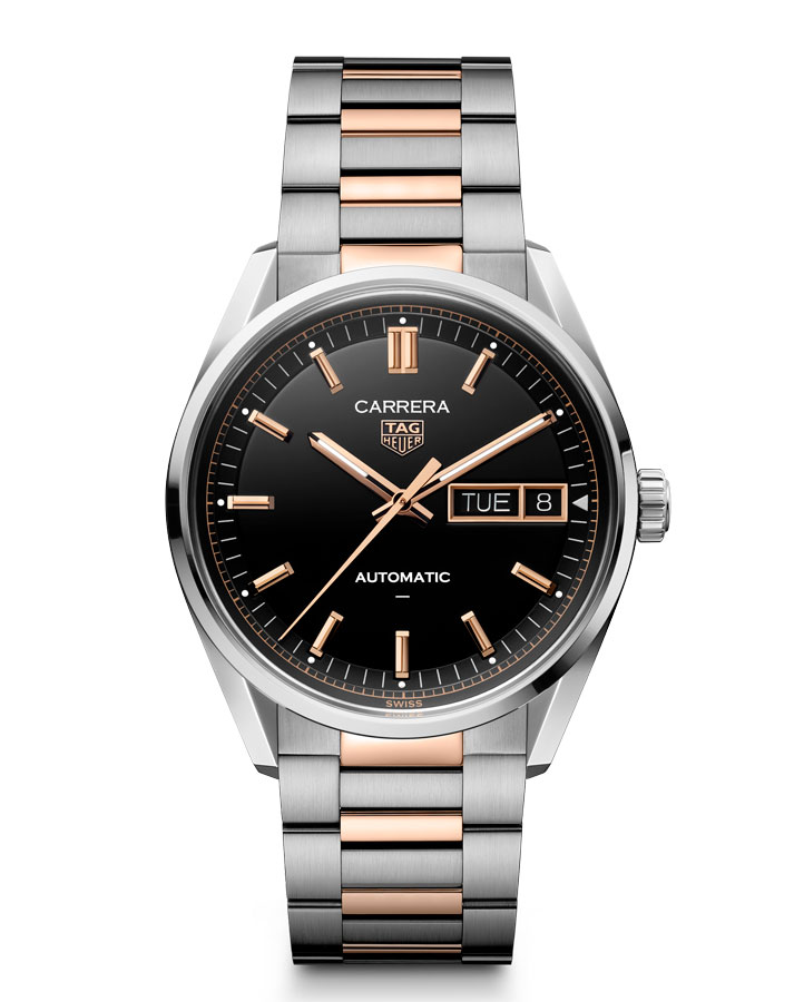 - Carrera Day-Date with black dial on two-tone steel and rose gold-tone steel