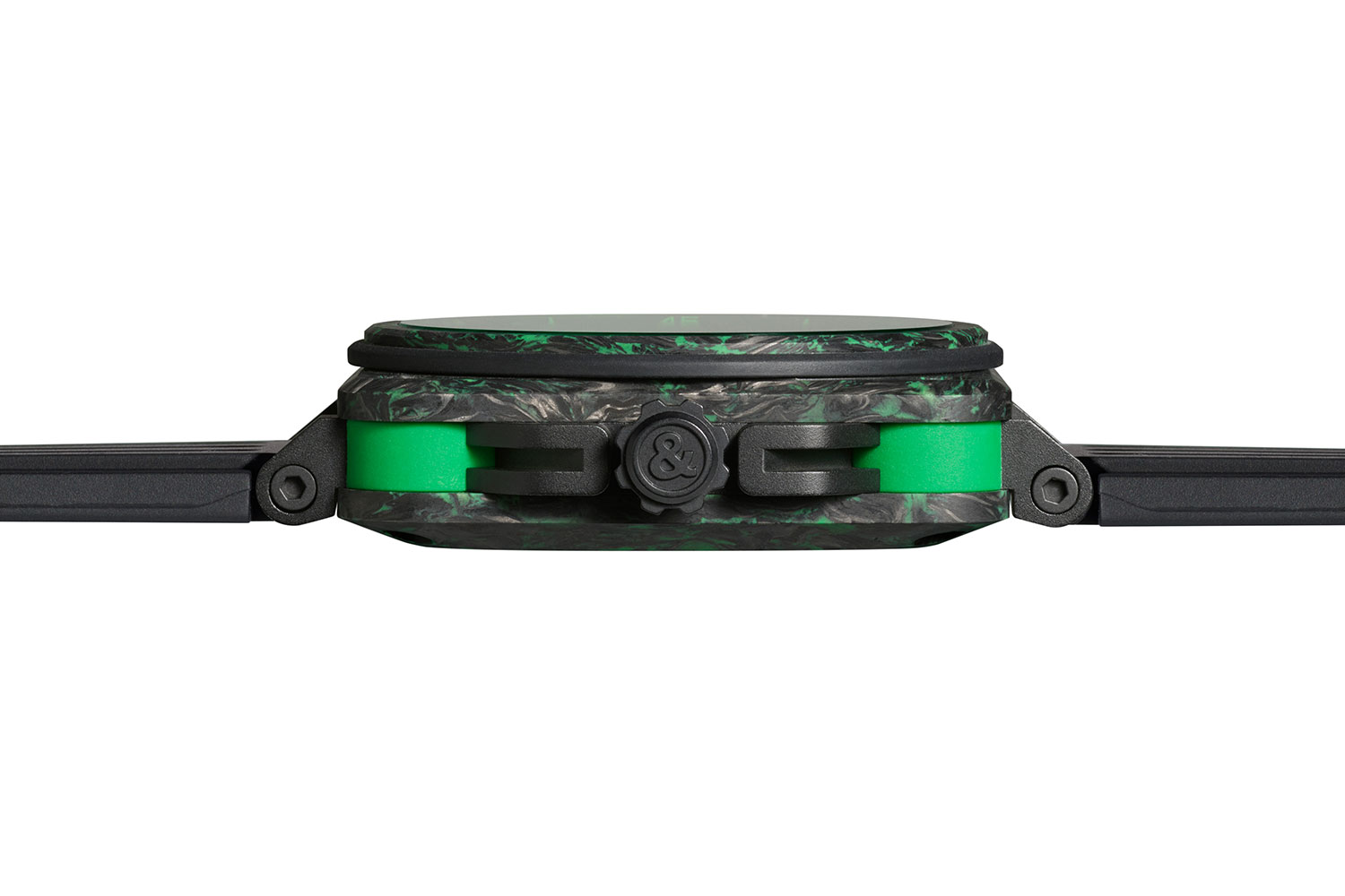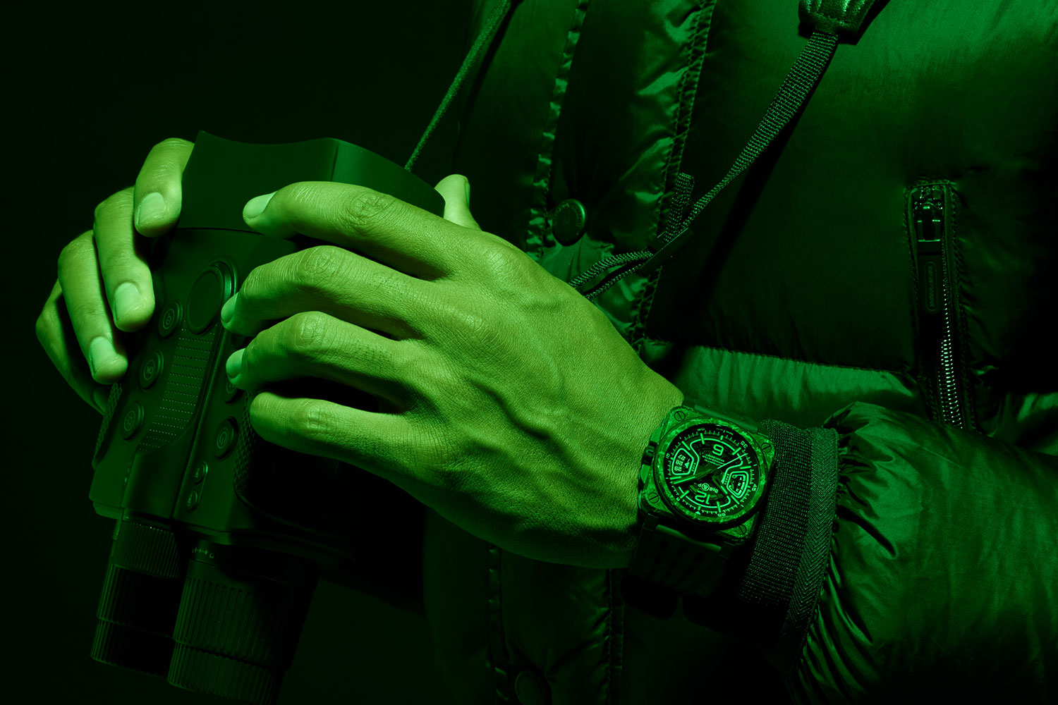 Encasing the Night Vision edition is a 41mm multi-component case that employs the familiar “sandwich” construction. Two main plates are made from LUM-CAMO, a high-tech composite of carbon fiber and SLN resin. These plates are fastened with four screws housed in protective cylinders, which for this edition are green rubber and photoluminescent.