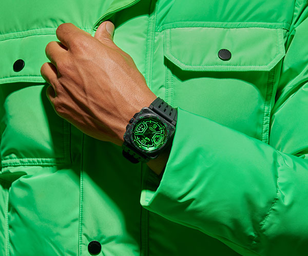 The photoluminescent green-highlighted cutout pattern is topped with a green-tinted sapphire crystal