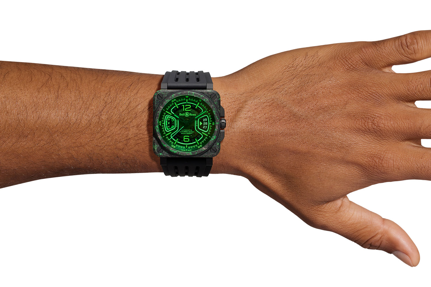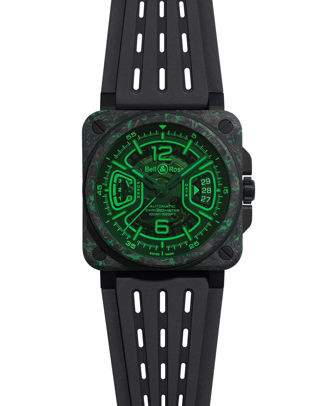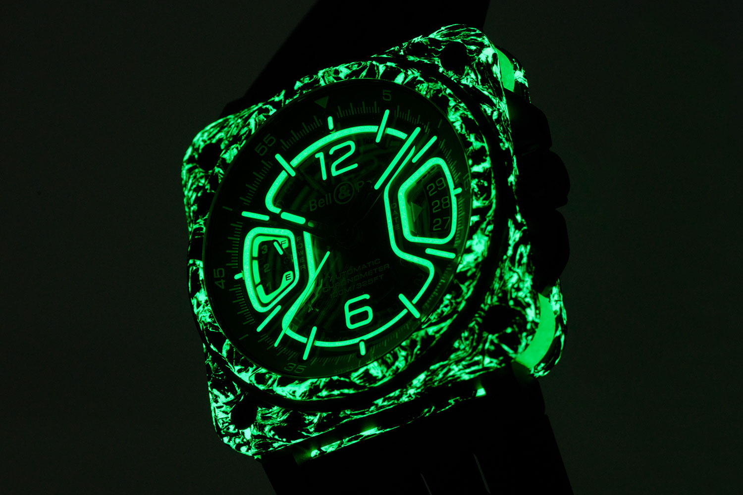 The BR-X3 Night Vision propels the BR-03 into a contemporary dimension, taking cues from one of the most technologically demanding environments imaginable: nighttime aerial missions. The brand has long been inspired by cockpit instrumentation, and in this iteration, it’s taken the philosophy further, combining photoluminescent technology, and a bold aesthetic that evokes a fighter pilot’s HUD (head-up display).